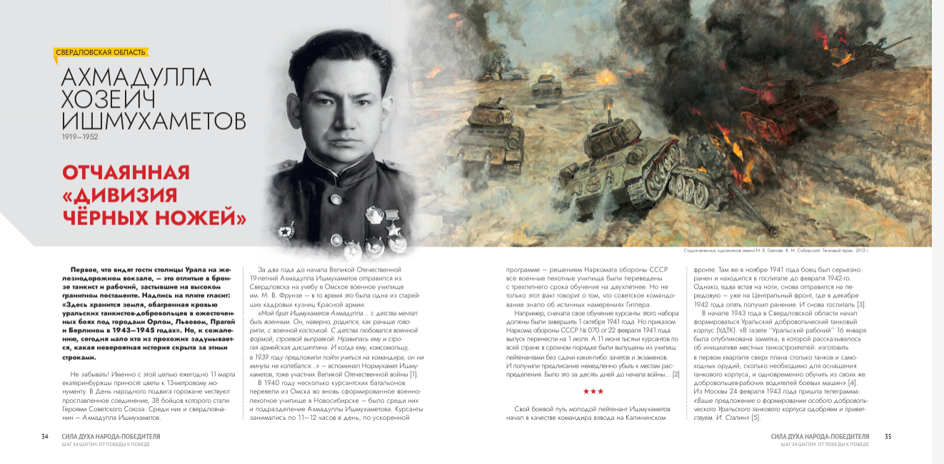В книге есть и история героя-свердловчанина – Ахмадуллы Ишмухаметова, который совершил немало подвигов в составе Уральского добровольческого танкового корпуса.