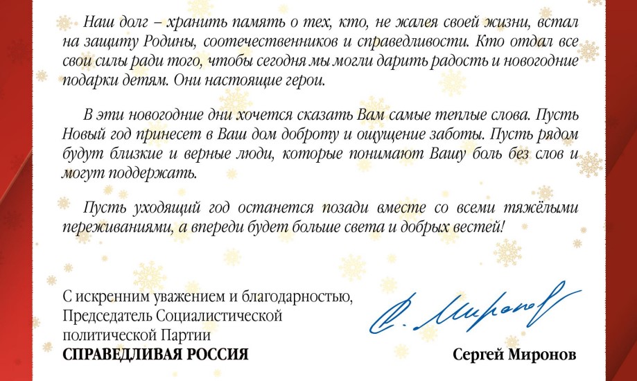 "Наш долг – хранить память о тех, кто, не жалея своей жизни, встал на защиту Родины, соотечественников и справедливости. Кто отдал все свои силы ради того, чтобы сегодня мы могли дарить радость и новогодние подарки детям. Они герои", – теплые слова поддержки от лидера партии адресованы семьям погибших.