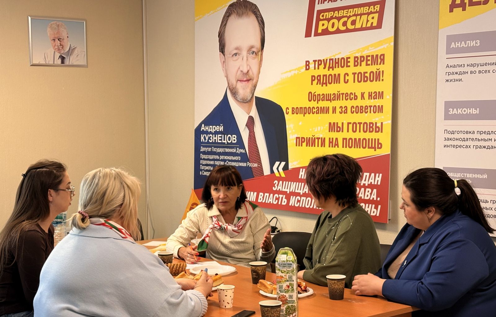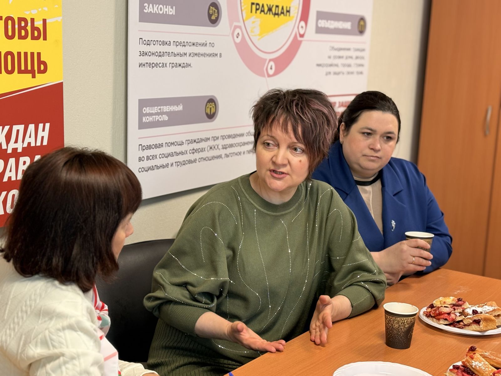 В разговоре за чашкой чая приняли участие руководитель аппарата Реготделения партии Наталья Гулаенко, депутат Вехнепышминской Думы и председатель местного отделения СР Олеся Орлова, женский актив города.