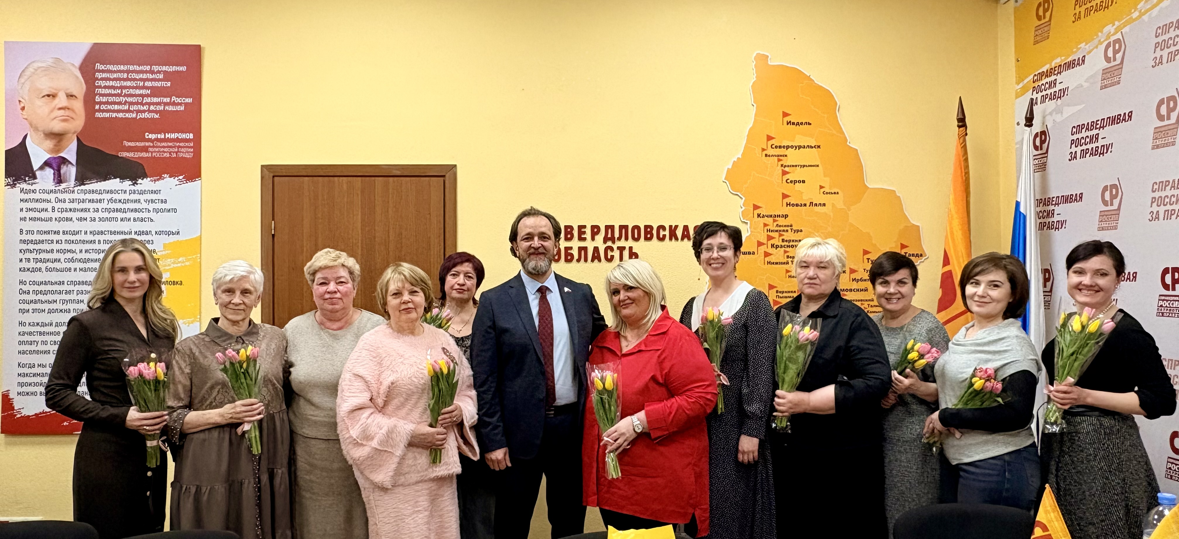 В преддверии женского праздника депутат Государственной Думы, лидер свердловских справедливороссов Андрей Кузнецов собрал самых активных партийцев, активистов, волонтеров, чтобы поздравить с 8 Марта и поблагодарить за работу. Он отметил, что СР по сути – женская партия, потому что в ее составе 60% женщин и 40% мужчин.