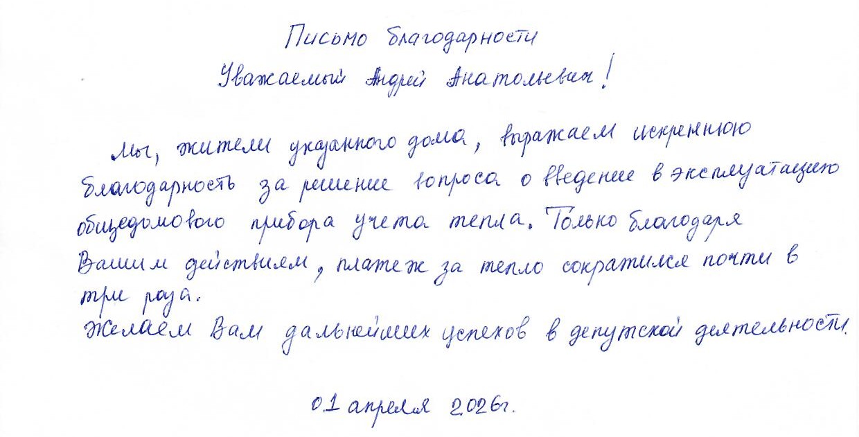 И только после второго запроса депутата Кузнецова и очередного вмешательства прокуратуры ситуация стала меняться. В январе этого года общедомовой прибор учета тепла введен в эксплуатацию и уже в феврале люди за ту же услугу заплатили почти в 3 раза меньше. Жильцы дома написали письмо, в котором поблагодарили Андрея Кузнецова за помощь в решении их вопроса.